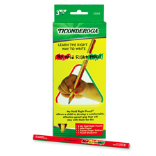 Ticonderoga My Hold Right Pencils are designed to help teach children how to correctly hold a pencil. These pencils help children develop proper letter formation and improve handwriting skills, using colored stickers that correspond to the colors on the sides of the triangular pencil. Pencils are ergonomically designed for both left-handed and right-handed writers. No. 2 graphite lead delivers smooth writing. Pencils include one pencil sharpener, one colorful mini-poster illustrating the color-coded, pincer-grip technique, and one packet of finger stickers. PMA certified nontoxic.