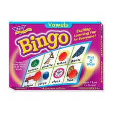 Vowels Bingo Game offers active learning that delivers results. Practice phonics skills with long and short vowels in 30 words. Match words, photos, or both to vowels. Unique, six-way format adapts to a variety of skill levels, and is a fun learning supplement for small groups or the entire class. Also ideal for learners with disabilities and anyone learning English. Set includes 36 playing cards, more than 200 chips, caller's mat and cards, and a sturdy storage box. Ideal for first to fourth grade (ages 7 to 10).