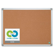 Eco-friendly bulletin board features cork made of recycled material and a sleek aluminum frame. Resilient cork surface is self-healing, leaving no pinholes behind, and withstands intensive use. Easily mount with included hardware. Entire board has a high percentage of recycled material.