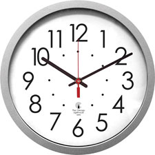 14-1/2" Contemporary Quartz Wall Clock features a UV-protected lens, black hour, minute and second hand, and a designer white dial face with black Arabic numerals in a silver contoured plastic case. Clock runs on one AA cell battery (sold separately).