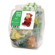 Tub display showcases Baumgartens Wind-up Flipping Animal Toys. Made of clear plastic so passersby can see which animal they want. Cookie-jar design allows them to dig for their favorite. Wind-up toy animals are great for cute gifts or party favors. Animals flip so they are perfect for pet lovers and anyone having a bad day. Toys are made of plastic and require no batteries. Mechanism works by dragging them back on their wheels until you feel tension. Display contains 18 assorted Wind-up Flipping Animal Toys.