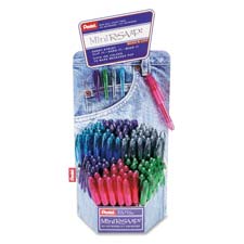 Display showcases Pentel R.S.V.P. Mini Ballpoint Pens in a colorful array. Design of the display features an incline so pens stand lined up but are each still highly visible. One pen can be clipped onto the 3D belt loop on the blue jeans background. This ballpoint pen goes anywhere and fits anywhere. Drilled eyelet in cap lets you clip it to a backpack, hang it on a key chain or wear it around your neck. Latex-free rubber grip offers extended writing comfort and control. Nonrefillable pen delivers smooth, medium lines and features a stationary tip and fixed sleeve. Ideal for notes and cards. Display contains 72 pens with the following ink colors: 12 in black, 12 in blue, 12 in green, 12 in pink, and 24 in violet.