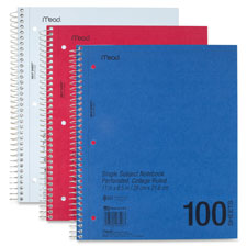 Wirebound notebook offers a one-subject format. Contains 100 perforated sheets of college-ruled paper with a margin. Notebook cover and sheets are three-hole punched to fit inside standard three-ring binders.