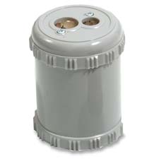 Two-hole sharpener features a receptacle and metal sharpening unit with a honed steel blade to sharpen standard-size, oversized pencils and crayons. Made of plastic. Sharpener meets or exceeds standard for RoHS compliance for lead, mercury, bromine, chrome and cadmium.