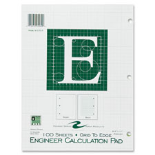Engineers pad features grid-to-edge, 5 x 5 quad-ruling on the back of each sheet. The front has a simple outline. Each sheet is three-hole punched to fit inside standard-size, three-ring binders.