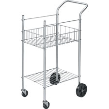 Wire mail cart holds 75 letter-size or legal-size hanging folders (sold separately). Design features a contoured raised handle for easy steering, front swivel casters and smooth-gliding rear wheels. Bottom shelf holds bulk mail or packages up to 50 lb. Top basket measures 15" wide x 18" deep x 5-1/2" high. Bottom shelf measures 15" wide x 18" deep. Mail cart is made of chrome-plated steel wire and holds a total of 125 lb.