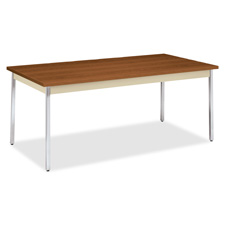Rectangular utility table offers a spacious, sturdy design for general office use. Design features 1-1/4" thick high-pressure laminate top, 3-1/8" high heavy-gauge metal apron, metal legs, square corners and PVC-edge banding. Square chrome-plated legs have adjustable, nonmarring, leveling floor guides. Table meets or exceeds applicable ANSI/BIFMA standards.