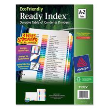 Eco-friendly index dividers are made with a high percentage of recycled paper. Use coordinated system of reinforced table of contents page and matching preprinted tab dividers from A to Z to make referencing easy. Design features heavyweight paper, strong reinforcement that keeps tabs from tearing, and double-sided hole reinforcement that prevents divider from tearing out of the rings. Customize included table of contents page with free online templates and print them on your laser or inkjet printer.