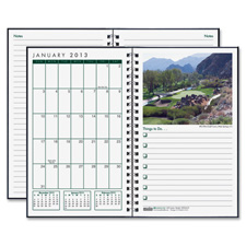 Monthly journal offers a full-color golf photo on every two-page-per-month spread. 12 months of dated planning range from January to December. Two-page-per-month spreads feature ruled notes space below the golf photo, unruled daily blocks (5/8" x 1-1/8") on the left page, holidays and past, current and future months reference. Monthly journal includes ruled journal pages and a suede-like cover. Calendar pages are made with a high percentage of recycled material.