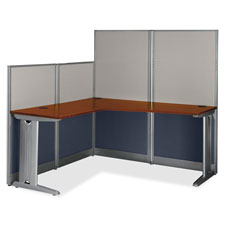 Office in an Hour L-workstation features short panels for collaborative opportunities and tall panels to create privacy. Metal-framed, cushioned panels are covered by two-tone fabric. Durable melamine surfaces are scratch-resistant and stain-resistant. Use desktop grommet for wire management. Removable face plate on metal desk legs hides cords and cables. Installed adjustable levelers compensate for uneven surfaces. Workstation comes in two boxes and must be ordered separately for a complete unit.