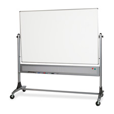 Double-sided board features porcelain steel for a magnetic dry-erase surface on both sides. Surface rotates 360 degrees on a pivot hinge and locks into place with the turn of a knob. Ideal for presentations, meetings, training, and other group instructional situations. Board has anodized aluminum Euro trim with rounded injection-molded plastic corners. Perforated steel panel offers stability and a storage area for magnets, markers, and erasers (all sold separately). The wide base design adds stability and rolls on 3" locking casters.