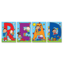 Bulletin board decoration set includes four charts to promote reading. Each chart features one of the letters that spell, "Read," and pictures of children reading. Set includes a resource guide.
