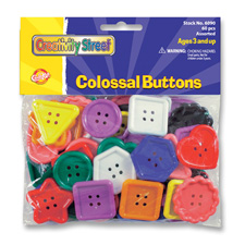 Extra large buttons are designed for use in craft projects. Colossal Buttons come in assorted colors and shapes, such as triangles, squares, hexagons, hearts, flowers and stars. Buttons are made of plastic. Small parts are not suitable for children under 3 years of age.