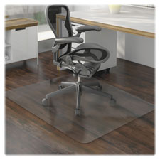Chairmat with no lip is designed for hard floors including wood, vinyl and tile. Design features vinyl construction and a straight edge. Rectangular chairmat protects floors from chair scuffs and caster damage.