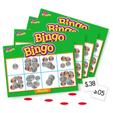 Money Bingo Games help students practice adding pennies, nickels, dimes, and quarters. Match money amounts to images of heads and tails. Unique, six-way format adapts to a variety of skill levels, and is a fun learning supplement for small groups or the entire class. Bingo Games are also ideal for learners with disabilities and anyone learning English. Set includes 36 playing cards, more than 200 chips, caller's mat and cards, and a sturdy storage box. Bingo Games are ideal for students in kindergarten to third-grade (ages 5 to 9).