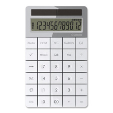 12-digit desktop calculator features a display panel made from recycled, pre-consumer material of Canon digital cameras. Slim, compact body includes a large internal angled LCD, polished upper casing with IT/PC-feel top keys and a metal lower casing with nonslip rubber feet. Functions include cost-sell-margin, grand total, sign change, backspace key, square root, sign change, grand total, backspace and memory keys (RM/CM, M plus, M minus). Calculator runs on solar power.