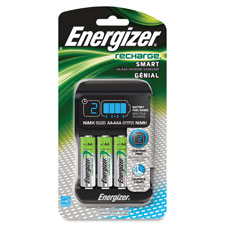 Recharge Smart Charger features a countdown timer that shows how long until batteries are charged and a Battery Fuel Gauge that shows the charge status. Large visual display can be viewed from across the room. Bad Battery Alert detects alerts and shuts off charging when a non-NiMH or old NiMH battery is inserted. Charger charges two or four AA or AAA NiMH rechargeable batteries and charges batteries at a safe, steady rate, which improves the long-term health of the NiMH battery. Smart Charger includes four AA rechargeable batteries. Energy Star qualified.