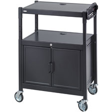 Audiovisual cart with cabinet adjusts in height from 26" to 42" in 2" increments and holds up to 20" monitors. Store all your media and other materials securely in the locking cabinet. All-steel cart rolls easily on four swivel casters (two locking). The UL-approved mini-surge protector has three outlets and a power switch.