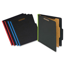 Classification folders are perfect for organizing, color-coding projects and more. Exterior is all black except for the colored Tyvek gusset. Document storage in four separate sections is made of sturdy 25 point Pressboard bonded with long-lasting gussets. Two fasteners are affixed to the inside front and back cover. Double-sided fasteners are on the 17 point kraft divider. Tabs on divider and folder are 2/5 cut right of center. Folders are made from a high percentage of recycled material.