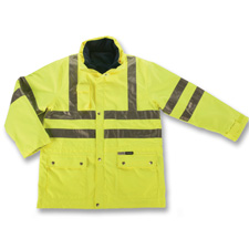 Class 3, high-visibility jacket increases your visibility during the day, as well as at night when illuminated by lights. Exterior is bright yellow with 2" level 2 ANSI-certified reflective tape horizontally and vertically across the chest and horizontally around the arms. Weatherproof outer shell is made of 300D oxford with breathable polyurethane coating. Inner jacket has a 100g lining. Safety jacket also features an inset hood with drawstring and stoppers, storm front with zipper and snap closure, and removable sleeves.