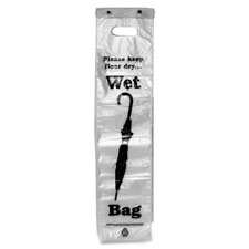 Umbrella bags are designed to hold wet umbrellas on rainy days. Each bag fits virtually all sizes of umbrellas. Using umbrella bags keeps floors dry and helps prevent slip-and-fall accidents, reducing liability lawsuits. Hang bags on Tatco Umbrella Bag Stand (sold separately) for easy access in entrance and reception areas. Bag design features a die-cut handle and the message "Please keep floor dry ..." printed at top. The bag also displays the words, "Wet Bag," with the image of an umbrella in between them to show the intended use. Recyclable bags are packed for easy display and are ready to hang on the stand.
