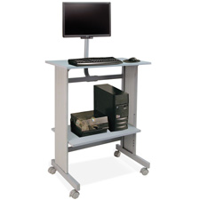 Stand-up workstation features an attached LCD mount to hold a flat-screen monitor securely in place and a space-saving fixed-height design. Workstation is designed to accommodate a computer monitor, desktop CPU or mini-tower CPU, keyboard and printer. LCD mount offers four-way adjustability to make viewing easy from any angle. Fixed keyboard shelf features pullout side extension for your mouse. Adjustable-height lower shelf holds a mini-tower CPU or printer and supplies and adjusts in 4-7/8" increments. Heavy-duty, dual-wheel casters allow the workstation to roll easily from location to location. Workstation is made with 3/4" melamine laminate and sturdy steel construction. Top shelf holds up to 100 lb. Bottom shelf holds up to 50 lb.