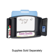 Deluxe Message Board doubles as a name plaque. Use the Lexan-covered area below the magnetic dry-erase board space to display your name, department or any customized graphic. Two side compartments hold two dry-erase markers and an eraser (all three sold separately). File pocket behind the dry-erase board holds letter-size files up to 1/2" thick. Writable surface measures 8-1/4" wide x 6-1/4" high.