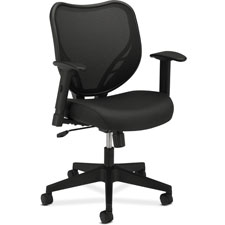 Mid-back chair offers a dramatically styled outback supports with a breathable mesh back, height-adjustable arms and a fabric seat. Adjustable height arms raise and lower arms, reducing shoulder, neck and back strain. Distance between arms is 17-3/4", and the height from the seat is 8-3/8" to 11". Other functions include pneumatic seat-height adjustment from 18-1/8" to 22-3/8", 360-degree swivel, tilt, tilt tension and tilt lock. Tilt adjusts seat and back to a reclined position for all-day comfort. Tilt tension adjusts the amount of resistance when reclining to accommodate individual weight and work styles. Tilt lock secures the chair in an upright position for constant back support when not reclining. Mid-back chair also features a five-star base with hooded 2-1/2" dual-wheel casters.
