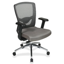 Executive high-back chair features a screen back with adjustable lumbar support, mesh fabric seat, and sturdy metal frame. Arms adjust in height from 7" to 9". Functions include pneumatic seat-height adjustment from 16-1/2" to 19", 360-degree swivel, tilt, tilt tension and tilt lock. Seat measures 20" wide x 19-1/2" deep. Back dimensions are 20" wide x 21" high. Nylon five-star base with aluminum caps offers 2" dual-wheel casters. Weight capacity is 250 lb.