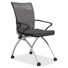 High-back chairs feature an ergonomic mesh back, integrated arm rests, padded fabric seat and synchro-tilt recline action. Ideal for training rooms. Seat cushions flip up allowing the chair to fold for compact, nesting storage. Sturdy frame is made of chrome. Weight capacity is 250 lb. Each chair with built-in flex rolls easily on four casters and meets or exceeds ANSI/BIFMA standards.