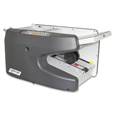 Autofolder is ideal for large mailrooms and offices. High-speed machine automatically feeds and folds a stack of documents up to 8-1/2" x 14" at a speed of up to 9,000 sheets per hour. Use autofolder to create five different folds: letter, half, z-fold, double parallel and church. No fanning is needed. Simply put the paper in and fold. Folder handles sheet sizes from 3-1/2" x 5" to 8-1/2" x 14" and paper types from 16 lb. bond to 70 lb. index. Feed table capacity is 150 sheets. Stapled sets of up to five sheets can be folded by hand-feeding documents into the feed table bypass. Conveyor exit table makes convenient, easy-to-handle stacks. Electrical autofolder also features removable fold tables, stacking wheels, self-centering paper guides, auto jam detect and auto shutoff.