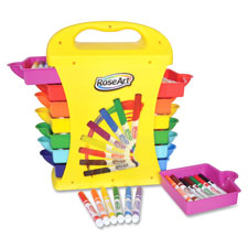 Marker Caddy features 14 colored drawers that each hold two eight-packs of colored markers (included). Two drawers fit on each level. Ideal for children ages 3 and up. Caddy is easy to set up and clean up. The sturdy carrying case design with molded plastic handle makes it easy to carry from room to room. Caddy and drawers are made of plastic. Caddy includes 208 nontoxic markers. Each set of eight colored markers includes purple, brown, blue, orange, red, green, yellow and black.