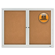 Enclosed outdoor bulletin board offers a self-healing cork surface and high-density backing for maximum pin-holding power, ensuring documents stay securely posted. Two locking, water-resistant, shatterproof acrylic glass doors and aluminum-vented casing allow posting, protecting and easily updating important messages. Satin-finish anodized aluminum frame offers full-length hinges and weather-resistant durability. Bulletin board includes one key per lock.