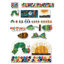 The Very Hungry Caterpillar Set includes the Carson-Dellosa Very Hungry Caterpillar Bulletin Board Set, Very Hungry Caterpillar Border and Very Hungry Caterpillar Good Work Holders. The Bulletin Board Set features 13 storytelling pieces (the largest approximately 22-1/2" x 9-3/4"), "The Very Hungry Caterpillar" header, and a resource guide. The border offers twelve 3' x 3" strips for a total length of 36'. Good Work Holders feature a self-adhesive backing that sticks instantly to most smooth surfaces, such as wood, metal and painted cinder blocks. Use the reusable adhesive strip on the front for displaying student work. The Very Hungry Caterpillar-themed holder can be repositioned again and again. Remove the holder without damaging your walls. Work holder includes four caterpillars and two suns.