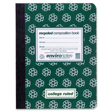 Composition book features a sturdy, green cover decorated with the recycled logo graphic. Cover also has rounded edges on the end opposite the black binding. Pages are center sewn and tapebound. Composition book contains 80 sheets. Each sheet is college-ruled with a margin.