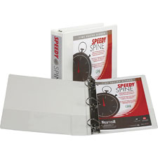 To save time and increase efficiency, Speedy Spine View Binder features a patent-pending channel construction that allows easy drop-in of spine inserts for custom graphics in seconds. Speedy Spine inserts load five times faster than traditional binders. No more wiggling, fighting or sweating to customize presentation binders. Clear overlay on front, spine and back cover allows easy customization. Two, clear inside pockets provide extra storage for loose documents. Angled D-ring binder also features vinyl-covered chipboard and three rings mounted to the back cover to reduce wear and help the letter-size pages lie flat. Binder is 100 percent recyclable.