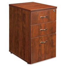 Locking pedestal easily slides under desk and credenza shells of the Lorell 68600 Series Laminate Furniture with contemporary-style laminate and raised floating tops. With a closed-top design, the freestanding pedestal can also be situated next to any of the 68600 components. Cherry laminate top and side panels are 1" thick for durability as well as stain-resistant and scratch-resistant. Particleboard core resists warping. Pedestal features two box drawers and one file drawer that accommodates both letter-size and legal-size files with the included hangrails. All drawers fully extend and roll smoothly on steel ball-bearing suspension. Design also includes central locking, 3mm PVC edges (color-matched) and adjustable floor glides for stabilization.