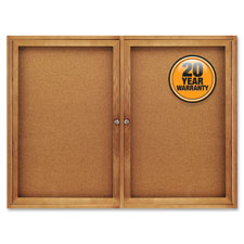 Enclosed, cork bulletin board delivers quality performance when communication is needed in any indoor environment. Two locking, shatterproof acrylic doors allow posting, protecting and easily updating important messages. Highly durable, enclosed natural-cork bulletin board is backed by high-density fiberboard. Self-healing surface and high-density backing deliver maximum pin-holding power, ensuring documents stay securely posted. Solid, oak finish frame with full-length hinges blends seamlessly into a range of interiors. Indoor bulletin board includes one key per lock. Hanging devices are factory-installed. Specially designed, security lock system secures board to wall.