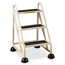 High-tensile, three-step aluminum ladder is welded for strength with visual appeal. The spring-loaded casters allow each lightweight ladder to roll where pushed and stop when stepped on. Ladder provides solid secure footing. Nonskid vinyl treads provide traction. Rubber bumpers protect other furnishings. OSHA/ANSI compliant ladder offers a 300 lb. load rating.